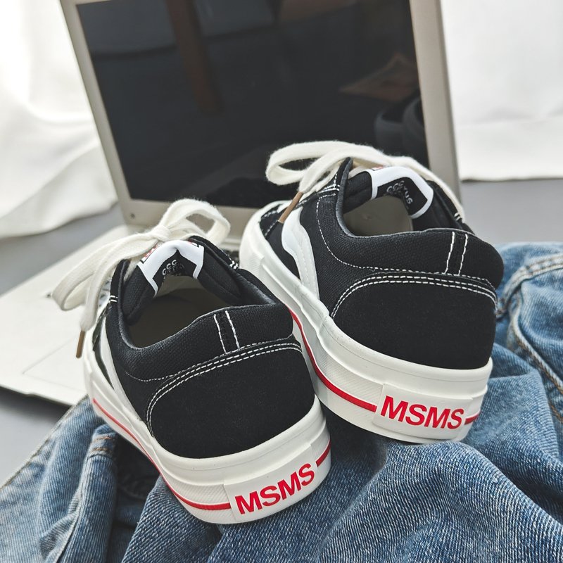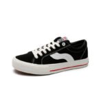 These black and white sporty casual shoes combine classic design with modern elements, delivering a versatile and stylish look for any occasion. The upper is crafted from premium canvas material, ensuring lightweight breathability and lasting comfort. The signature white wave stripe adds a dynamic and unique touch, while the reinforced white rubber toe cap and outsole enhance durability and slip resistance. A subtle red accent along the midsole adds a pop of color, giving the design a fresh and vibrant feel. The cushioned insole and soft inner lining provide superior comfort, keeping your feet relaxed throughout the day. Perfect for daily commutes, streetwear, or casual outings, these sneakers are a must-have addition to your wardrobe.