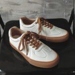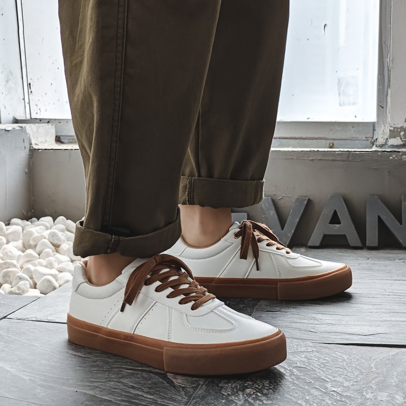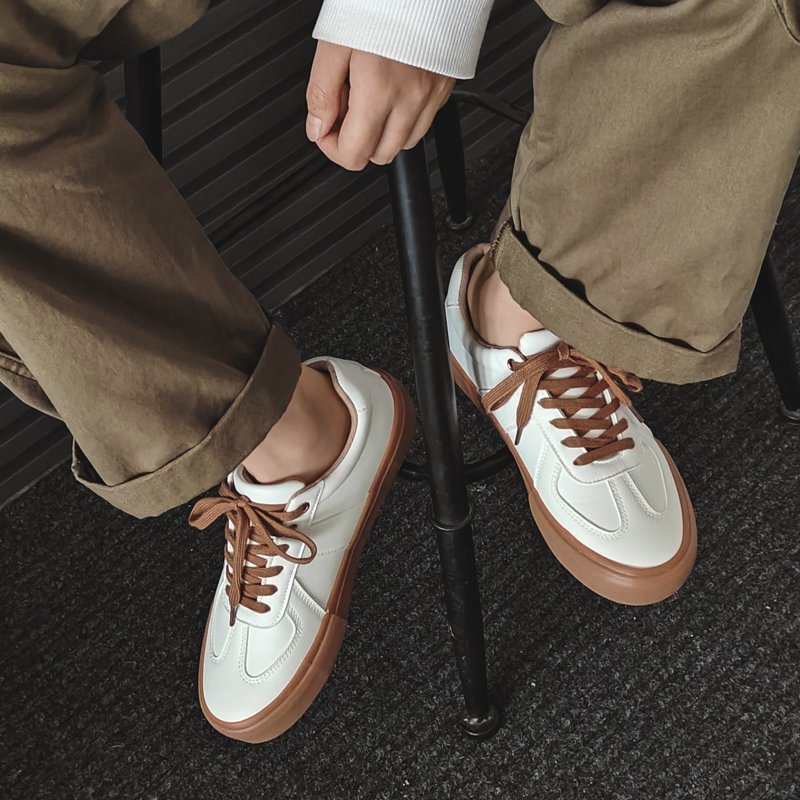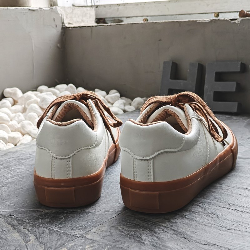 These stylish and minimalist white casual shoes are designed with a focus on classic aesthetics and practical functionality, making them a perfect match for various everyday outfits. The upper is crafted from high-quality synthetic leather, offering a smooth texture and easy-to-clean surface for a sleek and refined look. Paired with brown rubber soles and matching laces, the design exudes a subtle retro vibe while providing excellent traction and durability for stable, comfortable walking. The soft and breathable inner lining ensures a lightweight and snug fit, delivering all-day comfort. Whether for commuting, traveling, or casual outings, these shoes add understated elegance and timeless style to your wardrobe.